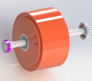 1つの回転子で、右軸(時計回り)と左軸(反時計回り)が互いに逆方向へ同時に作動する駆動モーターです。